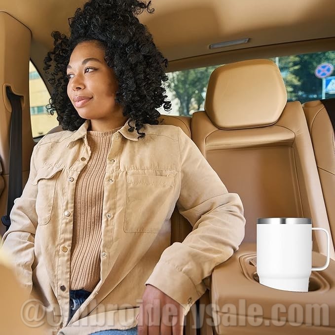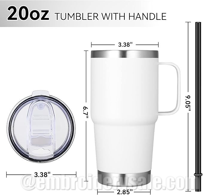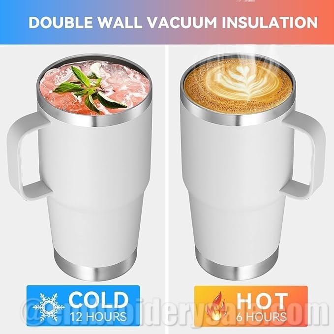 Cup holder Friendly: The travel coffee tumbler 20 oz is designed with a tapered shape which fits most car cup holders, equipped with a sturdy handle that allows easy carrying. Diameter 3.38" large cup mouth makes it easier for you to clean the stainless steel mug